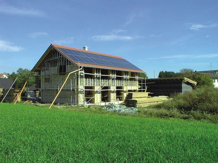 Bis zur Oberkante der Betonbodenplatte hebt sich das Wohn- und Geschäftshaus von Bernhard Späth, Hausherr und zugleich Planer sowie Ausführender der haustechnischen Anlagen kaum von anderen Gebäuden ab. Lediglich eine Vertiefung in der Bodenplatte deutet schon in dieser Bauphase Ungewöhnliches an (Bild 1). In ihr wurde später ein 15-m 3 -Pufferspeicher aufgestellt. Ohne die Vertiefung war die Höhe des Speichers nicht unterzubringen. Ab der Bodenplatte wurde bei dem Gebäude allerdings im Vergleich zu heute üblichen Bauweisen vieles grundsätzlich anders und nachahmenswert gemacht.