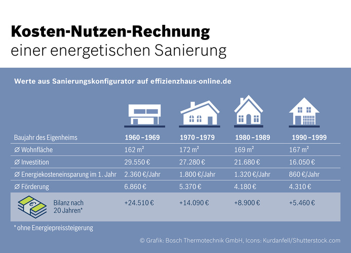 Eine energetische Sanierung ist oft günstiger als gedacht, auch weil die meisten Hausbesitzer staatliche Fördermittel nicht beachten oder unterschätzen. Im Durchschnitt können Sanierer 20 % der Investitionskosten über Fördergelder finanzieren. Die Zahlen hat Bosch aus den Suchprofilen von rund 33.000 Sanierungsplanern abgeleitet. So viele Menschen haben zwischen Oktober 2015 und Januar 2016 den gewerkeneutralen Sanierungsrechner genutzt. Er ist das Kernelement des Portals und wurde von Bosch mit Unterstützung des Fraunhofer-Instituts für Bauphysik IBP entwickelt.
