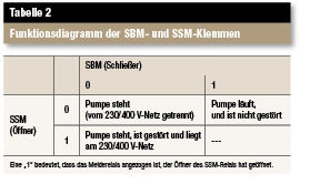 Kommt es darauf an zu prüfen, ob die Pumpe tatsächlich läuft, so ist die Betriebsmeldung SBM auszuwerten. So steht die Pumpe beispielsweise still, falls eine Störung vorliegt oder die Pumpe vom Netz getrennt wurde. Beide Fälle können aber aus der Auswertung des SBM-Kontakts allein nicht unterschieden werden. Wird, wie Tabelle 2 zeigt, nur der SSM-Kontakt ausgewertet, kann die Pumpe trotz nicht gestörtem Betrieb still stehen, sobald die 230/400V-Versorgung unterbrochen ist. Zu einer umfassenderen Zustandsaussage kommt man aus der Auswertung von SBM- und SSM-Kontakt. Dadurch kann eindeutig unterschieden werden, ob die Pumpe wegen einer Störung (SSM = 1) oder einer Netzunterbrechung (SSM = 0) still steht. Die Wilo-Protect-Module bieten beide Klemmen für alle ein- und dreiphasigen Pumpen der Baureihe TOP-S serienmäßig.