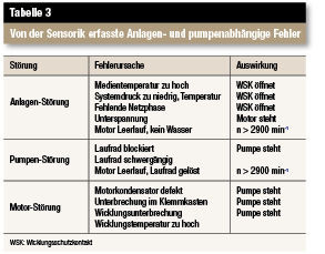 Die im Protectmodul vorhandene empfindliche Sensorik erfasst das modulierte Magnetfeld, wertet dieses aus und zeigt die Störung über eine rote Stör-LED und das Störmelderelais an. Welche Fehler zu einem Pumpenstillstand führen können, zeigt Tabelle 3.
