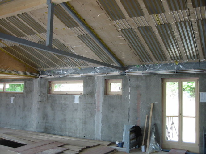 Die zum Teil nur 15 cm dicken vakuumgedämmten Außenwände mit U-Werten von bis zu 0,06 W/(m 2 K) bilden den Hauptgrund für die notwendige Kühlung. Auf der einen Seite stellt die Variotec-Sandwichkonstruktion „QASA“ aus Kreuzlagenholz-, Furniersperrholz- und Betonelementen mit integrierter Vakuumdämmung eine absolute Weltneuheit dar. Übliche Passivhäuser warteten bislang bei gleichem Dämmwert mit Wandstärken von mehr als 50 cm auf. Große, nach Süden orientierte Fensterflächen machen in der kalten Jahreszeit die Solareinstrahlung zur Gebäudebeheizung nutzbar. Den Luftwechsel in dem mit n 50 =0,33 h -1 extrem gut abgedichteten Gebäude, stellt eine zentrale Zu- und Abluftanlage mit Wärmerückgewinnung sicher.
