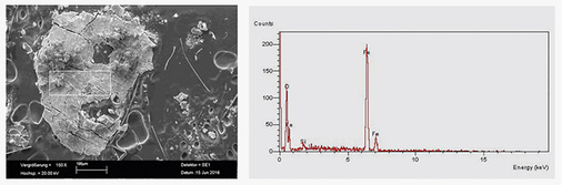 Die fünf Prüfkörper wurden nach ISO 10 289 bewertet und die Korrosionsschutzfähigkeit gemessen. Die Analyse der Korrosionsprodukte wurde mittels Rasterelektronenmikroskopie (REM) und die Untersuchung der chemischen Zusammensetzung mittels energiedispersiver Röntgenmikroanalyse (EDX) durchgeführt. Ein Beispiel für ein Ergebnis dieser Analyse mit sichtbaren Korrosionsanzeichen ist in Abb. 9 dargestellt.