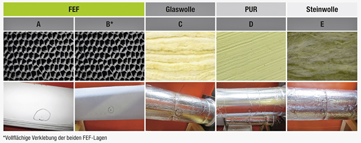 - System B: wie A, allerdings wurden die beiden FEF-Lagen (Flexible Elastomeric Foam) jeweils vollflächig verklebt (HT/Armaflex Industrial & Arma-Chek R)