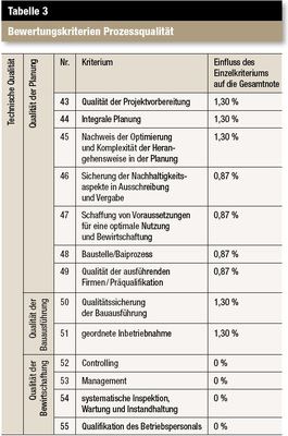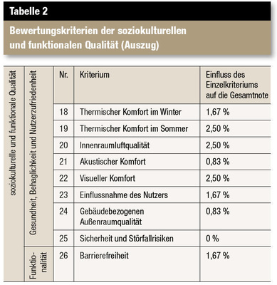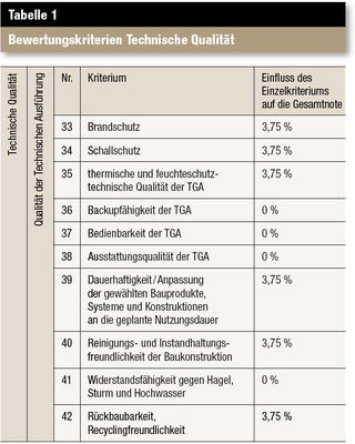 Es ist unverständlich, dass die technische und funktionale Qualität einen so niedrigen Bewertungsstellenwert einnimmt. Denn sie wird einerseits durch die Vielfalt der möglichen technischen Ausrüstungen (neben Heizung, Lüftung, Kälte auch Sanitär, Fördertechnik, Elektrotechnik, Automatisierungstechnik usw.), ihrer energetischen Qualität und ihrer Lebensdauer charakterisiert und zeichnet anderseits für die Gewährleistung der Funktion, d.h. der (besseren) Nutzbarkeit eines Gebäudes verantwortlich. Die Unterbewertung ist erkennbar an den Wichtungen und an den gegenwärtig zu berücksichtigenden Kriterien (Tabelle 1 und Tabelle 2).
