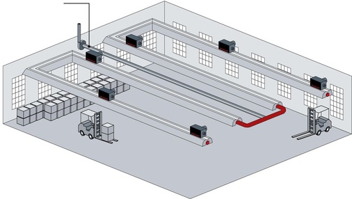 Insgesamt 1100 kW Heizleistung wurden indes in der Logistikhalle der VW-Tochter Sitech im polnischen Polkowice installiert. Sitech fertigt die Fahrzeugsitze für fast alle VW-Modelle. In dem 11000 m 2 großen Logistikzentrum wurden in 10 m Höhe 35 gasbefeuerte Strahlungsbänder mit je 9 m Länge abgehängt. Jeweils fünf Geräte sind abgasseitig zusammengefasst; die Abgase werden also über sieben Dachkamine abgeführt.
