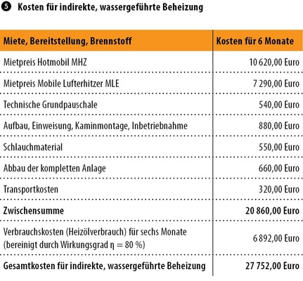 Um die Schlauchauskühlung und weitere Faktoren zu berücksichtigen, wurde für das direkte System ein bereinigter Wirkungsgrad von 70 % und beim indirekten System von 80 % angesetzt. Die Mietkosten wurden auf der Basis marktüblicher Vermietungskosten ermittelt. Die Kosten setzen sich aus den Mietkosten und den Verbrauchskosten für eine Einsatzdauer von sechs Monaten zusammen Abb. 4 Abb. 5 . Daraus ergibt sich bei Gesamtkosten von 27752 Euro für das System der indirekten, wassergeführten Beheizung eine Ersparnis von gut 12 %. Aufgrund der in der Betrachtung nicht berücksichtigten tatsächlichen Nutzung im Baustellenalltag ist dieser Wert eher als pessimistisch einzuordnen. •