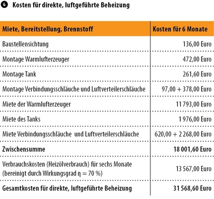 - In einer Fallstudie wurden die Gesamtkosten für eine Winterbauheizung über einen Zeitraum von sechs Monaten ermittelt. Verglichen wurden die direkte, luftgeführte Beheizung und die indirekte, wassergeführte Beheizung.