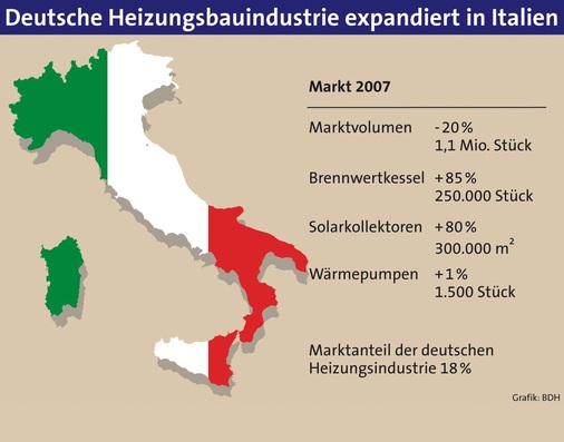 In England baute die deutsche Heizungsindustrie ihre Spitzenposition weiter aus: Bei einem Marktvolumen von insgesamt 1,7 Mio. Wärmeerzeugern (+10 %), davon 1,6 Mio. Brennwertheizkessel (+40 %), stieg der Anteil der deutschen Heizungsindustrie auf 53 %. Der Absatz von Solarkollektoren stieg geringfügig um 1 % auf 40000 m 2 . In Italien schrumpfte der Wärmeerzeugermarkt um etwa 20% auf 1,1 Mio. Stück, der Verkauf von Brennwertheizkesseln stieg indes um 85 % auf 250000 Stück. Auch Solarthermie boomte mit einem Plus von 80 % und jetzt 300000 m 2 Kollektorfläche. Wärmepumpen stagnierten auf vernachlässigbarem Niveau (1500 Stück). Der Marktanteil der deutschen Heizungsindustrie stieg auf 18 %.