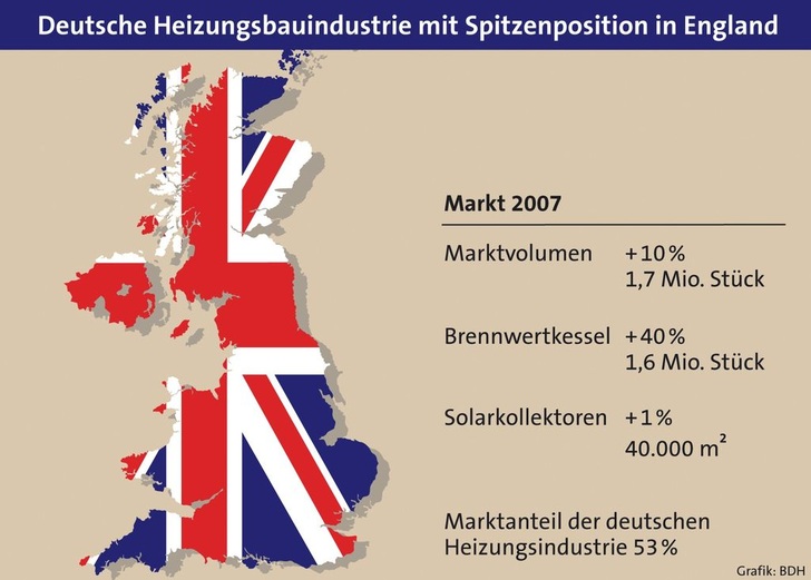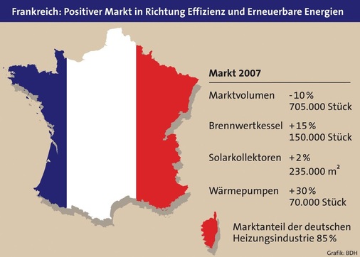 In Frankreich stieg der Absatz verbrauchsarmer Heizsysteme überproportional, während das Marktvolumen insgesamt um 10 % auf 705000 sank. Brennwertheizkessel legten um 15 % auf 150000 Stück zu, bei Wärmepumpen wuchs der Markt um 30 % auf 70000 Einheiten. Frankreich war damit erstmals der größte Absatzmarkt für Heizungswärmepumpen in Europa. Für solarthermische Anlagen stieg dort der Verkauf um 2 % auf 235000 m 2 (ca. 23500 Anlagen). Besonderer Nutznießer dieser durch Förderung und besonders ineffiziente Technik im Bestand initiierten Entwicklung war die deutsche Heizungsindustrie. Sie beeindruckte 2007 in diesen Marktsegmenten mit einem Marktanteil von 85 %.