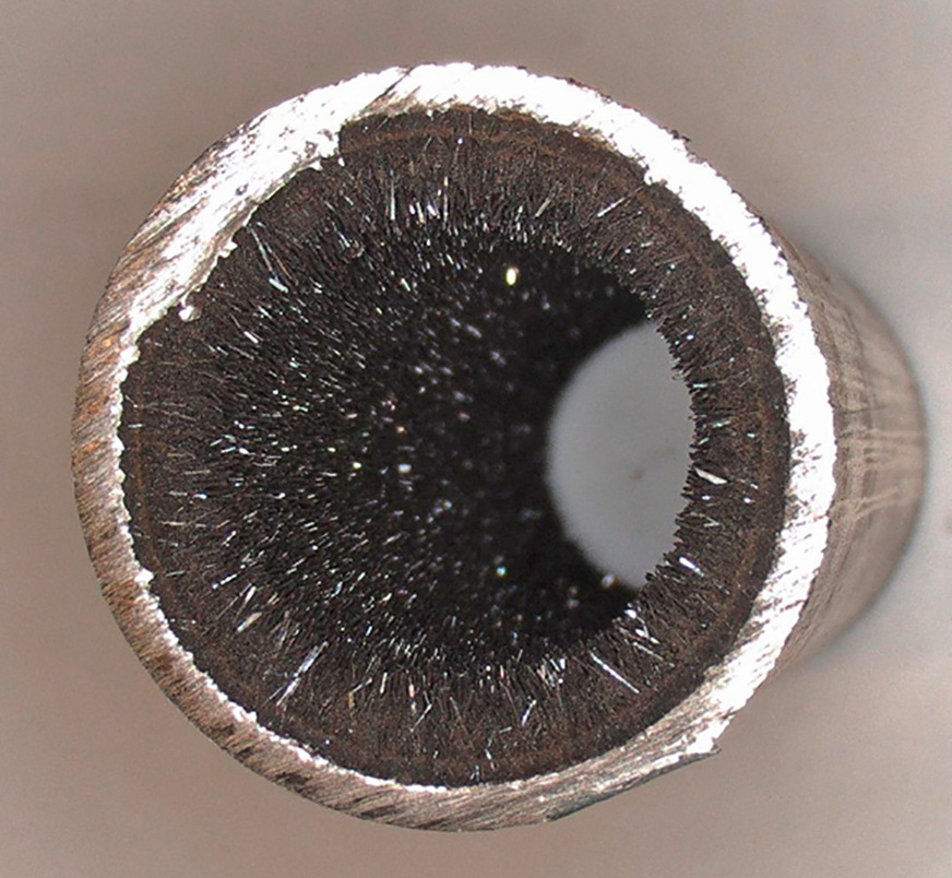 Dem Korrosionsmodell von (1) entsprechend kann eine höhere Sauerstoffkonzentration auch mehr elektrische Ladung (e–) übernehmen, die von den austretenden positiven Eisenionen beim Übertritt ins Heizungswasser am Metall zurückgelassen werden. Diese Depolarisation stellt eine Voraussetzung für den ungehinderten Auflösungsvorgang des metallenen Festkörpers dar. Letztlich führt dies zu einem Versagen des Bauteils oder zumindest zu einer übermäßigen Bildung von Magnetit (3). Fehlt der Sauerstoff, kommt dieser Korrosionsprozess zum Stillstand.