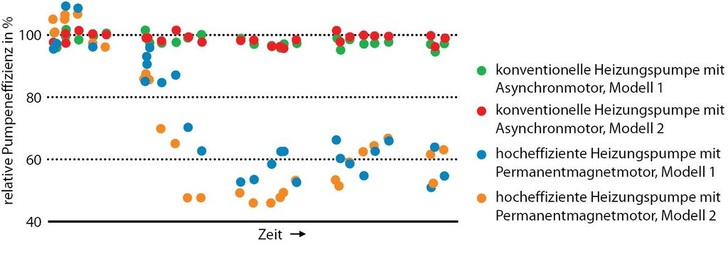 Die Untersuchungen zeigen, dass Magnetit im Anlagenwasser die Pumpeneffizienz sehr schnell um 10 bis 20 % verringert und nach einiger Zeit sogar halbieren kann Abb. 1 . Die Vergleichsmessung mit Standardnassläuferpumpen, bei denen der Rotor nur bei eingeschalteter Pumpe magnetisch ist, bestätigt die Branchenerfahrung: Auf dem Rotor setzen sich magnetische Partikel in der Regel nicht dauerhaft in einer problematischen Menge fest.