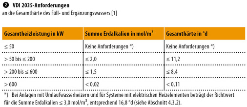 VDI 2035 Blatt 1 gibt in Abhängigkeit der Gesamtheizleistung und des spezifischen Anlagenvolumens Grenzwerte für die Gesamthärte vor – daran müssen sich der Planer und der Installateur orientieren, um kein Gewährleistungs-Risiko einzugehen. Das Ergebnis der Überprüfung sollten sie aus dem gleichen Grund gegenüber dem Bauherrn bzw. dem Betreiber schriftlich dokumentieren.
