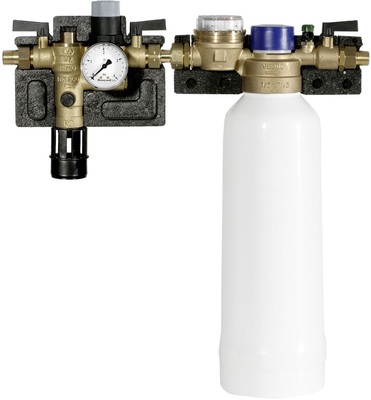 Die Nachfüllkombination NK300soft Abb. 3 Abb. 5 ermöglicht nicht nur eine sichere Heizungsnachfüllung, sondern sorgt auch für eine zuverlässige Enthärtung des Füll- und Ergänzungswassers für die Heizungsanlage. In nur einem Gerät erfüllt sie die Anforderungen der DIN EN 1717 zum Trinkwasserschutz beim Anschluss an Nicht-Trinkwassersysteme, wie den Heizungskreislauf, und gleichzeitig die Empfehlungen der VDI 2035 zur Enthärtung des Heizungswassers. Die Einstellung der gewünschten Resthärte erfolgt über einen Verstellgriff. Für das Gerät gibt es Kartuschen sowohl für die Enthärtung als auch für die Vollentsalzung, sodass sich beide Verfahren realisieren lassen.