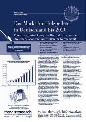 Die Studie „Der Markt für Holzpellets in Deutschland bis 2020“ gibt einen Überblick über die gegenwärtige Situation im deutschen Holzpelletmarkt sowie über aktuelle (gesetzliche) Rahmenbedingungen, die den Markt zukünftig beeinflussen werden. Die Marktentwicklung bis 2020 wird hinsichtlich der Wettbewerbsintensität, möglicher Vermarktungsalternativen und weiterer Einflussfaktoren abgebildet. trend:research setzte bei der Erstellung der Studie verschiedene Field und Desk Research-Methoden ein. In die Studie flossen 96 strukturierte Interviews mit Marktakteuren ein, die Aussagen über Markt, Wettbewerb, Trends und Optionen absichern. Die Studie umfasst rund 920 Seiten und kann für 3500 Euro bezogen werden bei: