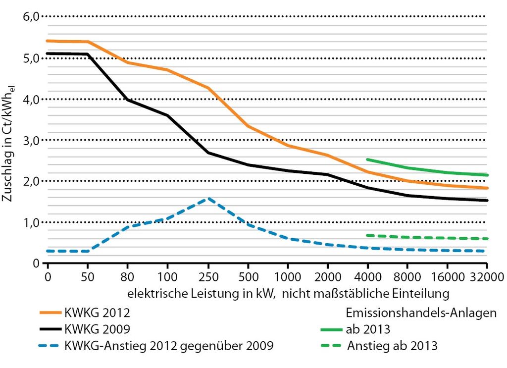 Die Zuschlagszahlungen auf den erzeugten KWK-Strom wurden mit 0,3 Ct/kWh el 3) etwas zu zaghaft erhöht. Jedoch bringt die Einführung einer neuen Förderkategorie für Anlagen von 50 bis 250 kW el in diesem mittleren BHKW-Bereich einen deutlich höheren Impuls, dessen Stärke sich erst auf den zweiten Blick erschließt Abb. 2 . Sie erhalten künftig statt des bisherigen Zuschlags von 2,1 Ct/kWh el einen deutlich höheren Bonus von 4,0 Ct/kWh el . Wegen der (bereits 2009 eingeführten) gleitenden Zuschlagszahlungen nach dem Prinzip des Stufentarifs profitieren davon auch noch deutlich größere Anlagen erheblich, was bisher in der Fachwelt noch kaum registriert wurde. So kommen beispielsweise 1-MW-Anlagen „im Windschatten“ der neuen Kategorie effektiv in den Genuss einer Erhöhung um 0,62 Ct/kWh el statt der nominalen 0,3 Ct/kWh el .