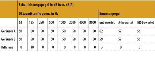 Die Spektren der gewählten Geräusche unterscheiden sich nur bei 125 Hz. Bei dieser Frequenz weist Geräusch A einen deutlichen tonalen Anteil auf, dessen Pegel von 60 dB um 10 dB über den übrigen Pegeln liegt und so als deutlich hörbarer, lästiger Einzelton wirken wird. Die bewerteten Summenpegel beider Geräusche sind trotz unterschiedlicher Geräuschspektren identisch. Somit ermöglicht weder die A-Bewertung noch das NR-Grenzkurvenverfahren dem Beurteilenden, den kritischen Einzelton im Geräusch A zu identifizieren.