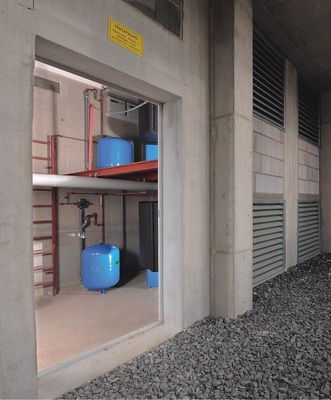 Um eine Belästigung von Fußgängern zu vermeiden, ließ man sich in Idstein auch auf der Ausblasseite etwas Besonderes einfallen. Vier der fünf Wärmepumpen blasen die Luft nicht einfach ins Freie, sondern in einen speziellen Anbau mit großen Öffnungen (Bild 1). Davor ließ Weidenfeller Schotter auffüllen, damit anfallendes Kondensat ins Erdreich versickern kann. Das Schotterbett hat aber auch einen akustischen Vorteil: Es wirkt schalldämpfend. Die fünfte Wärmepumpe wurde so aufgestellt, dass ihre Luftführung über den offenen Innenhof vor der Garagenanlage erfolgt.