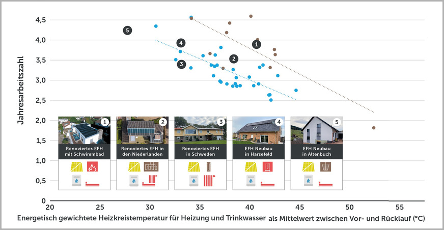 Jahresarbeitszahl sinkt bei höheren Heizkreistemperaturen