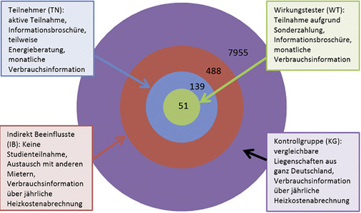 Indirekt Beeinflusste: Hierbei handelt es sich um die nicht am Modellvorhaben teilnehmenden Mieter in den Liegenschaften. Obwohl diese nach wie vor lediglich ihre jährliche Heizkostenabrechnung erhalten, könnten sie als Nachbarn der Projektteilnehmer sensibilisiert worden sein und sind daher als Kontrollgruppe ungeeignet.