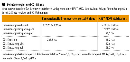 Aufgrund des intelligenten Zusammenspiels verschiedener Wärmeerzeuger lassen sich mit dem System HAST-AKKU Multivalent in der Gesamtbetrachtung deutliche Einsparungen bei den CO 2 -Emissionen und den Betriebskosten erzielen. Es nutzt die kontinuierliche Zwischenspeicherung zur Kompensation der Leistungsspitzen in der Trinkwassererwärmung und reduziert die Kosten für elektrische Hilfsenergie. Einen besonderen Anteil an den geringeren Betriebskosten trägt das Blockheizkraftwerk. Vergleicht man die leistungsspezifischen Investitionskosten aller Wärmeerzeuger, ist die Bereitstellung durch ein BHKW zwar um den Faktor zwölf größer als mit einem Gas-Brennwertheizkessel. In der Gesamtrechnung (Stromverkauf oder -eigenverwendung) sind dafür die Kosten pro kWh Wärme deutlich niedriger. Aufgrund dieses Kostenverhältnisses werden das BHKW sowie die Luft/Wasser-Wärmepumpe für eine möglichst lange Laufzeit dimensioniert. Um eine optimale Abstimmung der einzelnen Komponenten im realen Einsatz zu erzielen, werden HAST-AKKU-Systemlösungen ein Jahr per Datenfernübertragung optimiert.