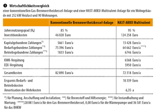 Abb. 5 listet die Ergebnisse des Vergleichs auf. Zusammengefasst liegen die Vorteile klar auf Seiten des multivalenten Systems: Während der Wärmeerzeuger Gas-Brennwertheizkessel im konventionellen System einen Jahresnutzungsgrad von 85 % (Heizwert, H i ) erreicht, schafft der gleiche Wärmeerzeuger 95 %, wenn er in die multivalente Anlage eingebunden ist. Das BHKW hat bei diesem System oberste Priorität. Die Luft/Wasser-Wärmepumpe wird zählertechnisch nur mit Strom aus dem BHKW betrieben (selbstgenutzter Strom gemäß KWK-Gesetz 2) ).
