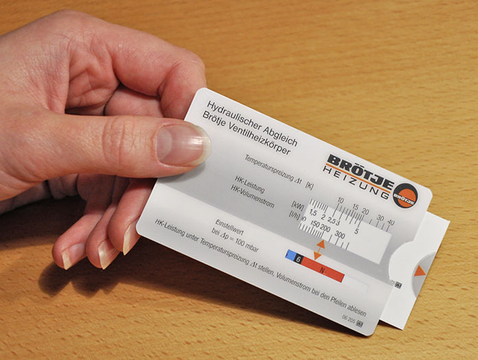 Brötje bietet seine Flachheizkörper EuroPlan, EuroProfil und MidiProfil mit voreingestellten Ventilen an, bei denen der Hydraulische Abgleich BAFA-anerkannt quasi inbegriffen ist – die angenommenen Randbedingungen passen in der Regel im Ein- und Zweifamilienhaus. Will man für größere Objekte die Einstellung kontrollieren – oder passen die Randbedingungen nicht zum Projekt – hilft ein Rechenschieber von Brötje bei der richtigen Einstellung. Er kann über info@broetje.de und Telefon (0 44 02) 8 00 angefordert werden. https://www.broetje.de/