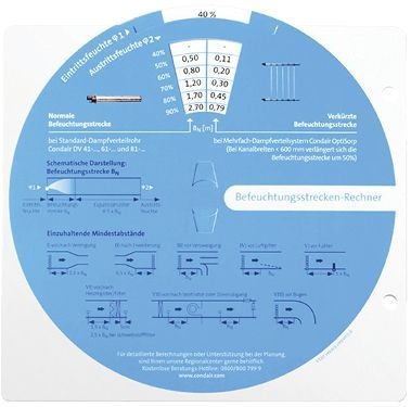 Mit der Befeuchterscheibe präsentiert Condair eine Arbeitshilfe und Grundlage für die detaillierte Beratung über alle Systeme zur Luftbefeuchtung. Die Vorderseite ermöglicht anhand verschiedener Kriterien eine schnelle Auswahl passender Systeme. Auf der Rückseite befindet sich ein Befeuchtungsstrecken-Rechner, mit dem eine verlässliche Grundlage für eine schnelle Ermittlung der Befeuchtungsstrecke erstellt werden kann. Condair stellt die praktische Befeuchterscheibe allen Kunden und Interessenten kostenlos zur Verfügung. Sie kann entweder direkt über die Condair-Regionalcenter bezogen oder über befeuchterscheibe@condair.com bestellt werden. https://www.condair.de/