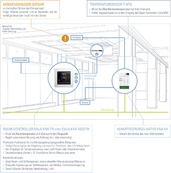 Das Thema Taupunkt rückt oft erst ins Bewusstsein, wenn es sich als Kondenswasser negativ auswirkt. Es entsteht häufig an den Bauteilen von Kühlsystemen, beispielsweise an kalten Rohren und Flächen. Wie man verhindert, dass es teuer wird, weil Wasser von der Decke tropft und die Bausubstanz geschädigt wird, zeigt ein Info-Flyer von Elsner Elektronik mit Taupunkt-Überwachung als Lösung. Sie ermöglicht es, rechtzeitig Gegenmaßnahmen einzuleiten. Durch die Verknüpfung von Sensoren, Raum-Controllern und Akto-ren im KNX-System lässt sich dies in jedem Projekt realisieren. www.elsner-elektronik.de