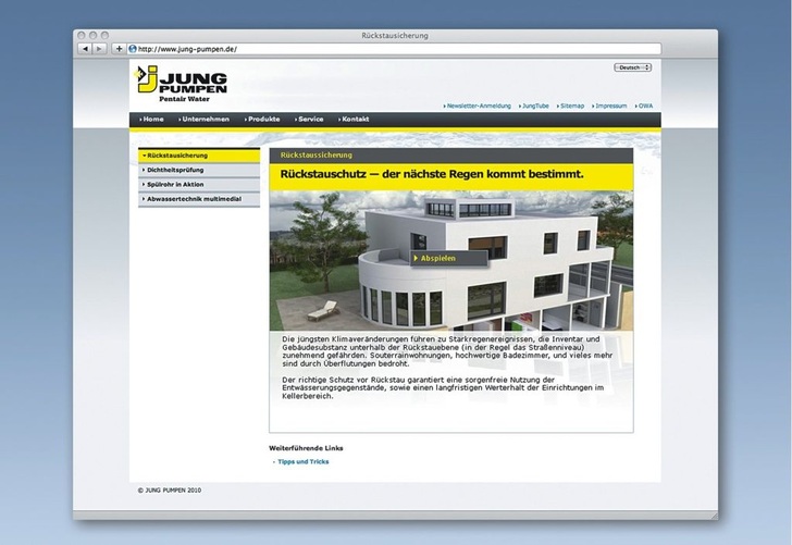 Die Entwässerung vieler Gebäude ist nicht ausreichend gegen Rückstau gesichert. Um Eigentümer vor dem Schaden klug zu machen, bietet Jung Pumpen Fachpartnern auf seiner Webseite eine Animation an, mit der sich die Auswirkungen fehlender Rückstausicherungsmaßnahmen verdeutlichen lassen. Ein Flyer mit grundlegenden Informationen zum Rückstauschutz kann unter andreas.kaempf@pentair.com bestellt werden. https://www.jung-pumpen.de/
