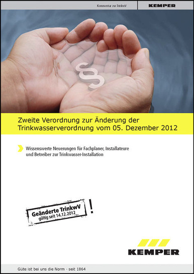 Die am 14. Dezember 2012 in Kraft getretene 2. Verordnung zur Änderung der Trinkwasserverordnung (TrinkwV) gab Anlass zur Überarbeitung des entsprechenden Kemper-Kommentars. Die Erläuterungen aus Expertenhand aus den Bereichen Recht, Hygienewissenschaft und Technik befassen sich ausschließlich mit der im Gebäude befindlichen Trinkwasser-Installation und richten sich an deren Betreiber, die jeweiligen Fachplaner und die ausführenden SHK-Betriebe. Die hilfreiche Navigation durch die Änderung der TrinkwV ist jetzt auch als PDF zum Download erhältlich (Rubrik Gebäudetechnik / Service / Downloads / Prospekte). Die Printbroschüre ist beim zuständigen Kemper-Fachberater im Außendienst erhältlich oder kann per E-Mail angefordert werden: daten service@kemper-olpe.de. http://www.kemper-olpe.de