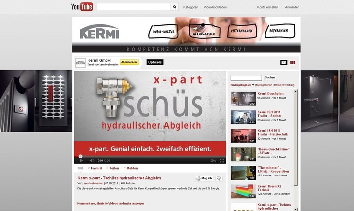 Kermi stellt auf seinem eigenen YouTube-Kanal http://www.kermi.tv Videos verschiedener Themenbereiche zur Unterhaltung, zur Information und zur Kundenberatung bereit. Anschaulich erklärt wird beispielsweise, wie der Hydraulische Abgleich von Heizsystemen mit den kv-voreingestellten Anschluss-Sets x-part quasi ab Werk erfolgt. Und wer schon immer mal wissen wollte, wie es in einem Heizkörper aussieht, bzw. wie die X2-Technologie funktioniert, kann sich auf eine virtuelle Reise durch den Energiesparheizkörper Therm X2 machen. Das Video zum Kermi Duschplatz erläutert Aufbau und Vorteile des Systems in Kombination mit Kermi-Duschkabinen. Eine unterhaltsame Alternative zu den Produkt-Clips sind die in Kooperation mit der FH Deggendorf entstandenen Videos zu Duschkabinen und Flachheizkörpern, die ironisch die Kultserie Raumschiff Enterprise und die Terminator-Filmreihe zitieren. https://www.kermi.com/de/de/