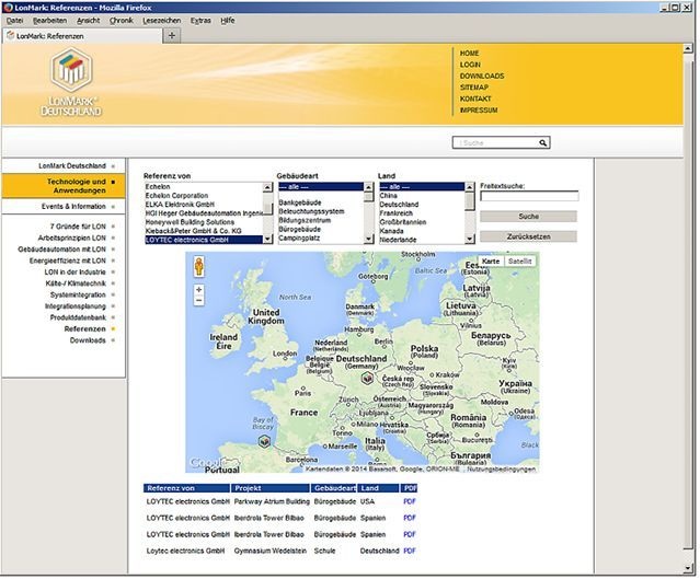 Die Referenzdatenbank von LonMark Deutschland bietet Informationen zu mehr als 100 LON-Projekten, überwiegend aus der Gebäudeautomation. Die Bandbreite reicht von Bürogebäuden über Einzelhandel, Hotels und Freizeitanlagen bis hin zu Verkehrsbauten und Wohnhäusern. Zu jedem Projekt gibt es ein PDF-Dokument mit ausführlichen Informationen. Die Referenzen können nach mehreren Kriterien – beteiligtes Unternehmen, Gebäudetyp und Land – sortiert werden. Außerdem steht eine Freitextsuche zur Verfügung. Eine interaktive Karte zeigt gleichzeitig den jeweiligen Standort der Referenzen. Ein Klick auf die Trefferliste oder die Karte führt zu den Datenbank-Informationen. https://www.lonmark.org/