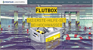 Das Hochwasser-Set Flutbox von Pentair Jung Pumpen enthält alle wesentlichen Komponenten, um größeren Schaden in Kellerräumen bei Überflutung zu vermeiden. Die robuste Kunststoffbox beinhaltet eine Schmutzwasserpumpe U5K und einen 12,5 m langen Feuerwehrschlauch. Die Pumpe ist in wenigen Minuten einsatzbereit und fördert sofort das Wasser aus dem Keller. Der Internetauftritt unter www.flutbox.com fasst alle wichtigen Informationen rund um die Erste-Hilfe-Box zusammen. Die Website beinhaltet neben Produktinformationen auch Videos und Animationen, die den Einsatzbereich der Hochwasserbox anschaulich zeigen. www.jung-pumpen.de