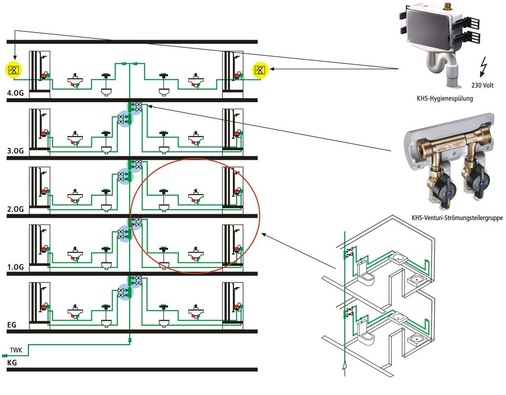 Kemper hat zur ISH ein umfangreiches System vorgestellt, das mit präventiven Maßnahmen die Trinkwasserhygiene verbessert bzw. die Grundbedingungen dafür gewährleistet. Eine ganz neue Armatur ist der KHS-Venturi-Strömungsteiler. Mit ihm kann eine Nasszellen-Zwangsdurchströmung erreicht werden, wenn im Stockwerk keine Verbrauchsmessung erfolgt und alle Zapfstellen durchgeschliffen installiert werden. Die Zapfung in einer höheren Etage sorgt dann für eine Durchströmung (Volumenstromanteil ca. 10 %) der Nasszellen-Installationen. Die zusätzliche Hygienespülung an der letzten Entnahmestelle nach unterschiedlichen Kriterien verhindert Stagnation auch, wenn gar keine Nutzung vorliegt. Weitere Armaturen mit Stellantrieben sowie Armaturen zur Temperatur- und Volumenstrommessung können für zeit-, volumenstrom- und temperaturgesteuerte Spülprozesse (Zwangsablauf) eingesetzt werden. Grundprinzip ist jeweils, einen kontrollierten bestimmungsgemäßen Betrieb abzusichern, der Stagnation, Korrosion und ungünstige Kaltwassertemperaturen vermeidet. Das ausgespülte Wasser kann als Betriebswasser verwendet werden.
