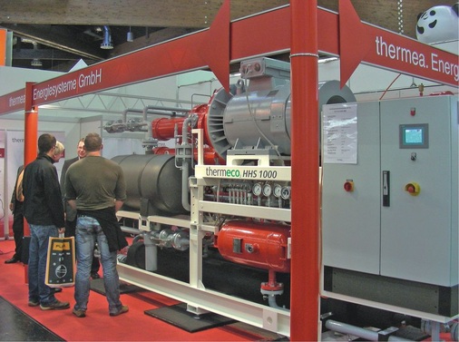 Ein echtes Highlight einer Industrie-Wärmepumpe war die Hochtemperatur-Wärmepumpe von Thermea Energiesysteme, Freital, die mit dem Kältemittel CO 2 Vorlauftemperaturen von bis zu 90 °C erreichen soll Abb. 4 . Die Nennheizleistung des Aggregates mit Schraubenverdichter gibt der Hersteller mit 1000 kW an. Im Heizbetrieb soll die Maschine einen COP von maximal 6,9, im kombinierten Heiz-/Kühlbetrieb von maximal 12 erreichen (mit Hubkolbenverdichter). Voraussetzung ist allerdings, dass Wärmequellen zwischen 8 und 40 °C zur Verfügung stehen.