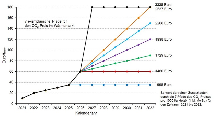 Der Barwert (Zinssatz 2 %) der CO 2 -Preis-bedingten Mehrkosten pro 1000 l/a Heizöl für den Zeitraum 2021 bis 2032 beträgt:
