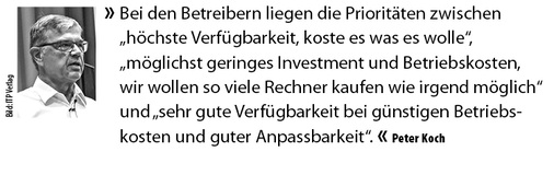 Koch: Betreiber lassen sich grundsätzlich unterscheiden in solche, die IT als Geschäft betreiben (Colocation oder Cloud), und solche, die IT brauchen, um ihr Geschäft zu betreiben. Darum liegen die Prioritäten auf verschiedenen Schwerpunkten zwischen „höchste Verfügbarkeit, koste es, was es wolle“ (Banken), „möglichst geringes Investment und Betriebskosten, wir wollen so viele Rechner kaufen wie irgend möglich“ (wissenschaftlicher Supercomputer) und „sehr gute Verfügbarkeit bei günstigen Betriebskosten und guter flexibler Anpassbarkeit“ (Colocation).