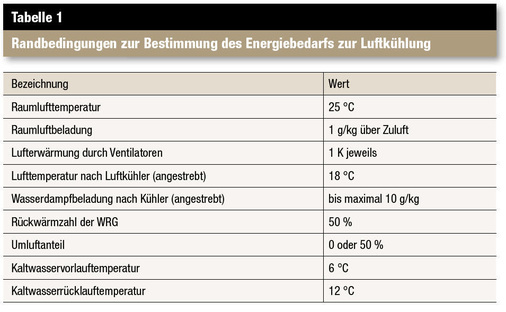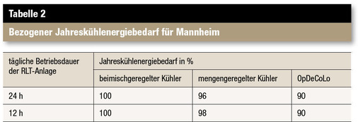 Die Berechnungen beruhen auf den statistischen Wetterdaten gemäß DIN 4710 (2003). Die Ergebnisse, bezogen auf den beimischgeregelten Kühler, sind in Tabelle 2 für zwei Betriebsdauern (12 h und 24 h täglich) für den Standort Mannheim zusammengefasst. Bei den für die Randbedingungen getroffenen Annahmen zeigt sich deutlich die Überlegenheit des OpDeCoLo gegenüber den herkömmlichen Schaltungen, weil ausschließlich beim OpDeCoLo immer nur dann entfeuchtet wird, wenn dies aus Behaglichkeitsgründen auch wirklich erforderlich ist.