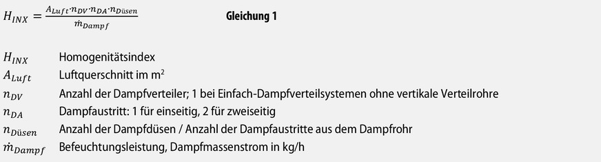 Der Homogenitätsindex HINX ist eine dimensionslose Kennzahl, zu deren Berechnung nur wenige Daten der Anlage sowie des vorgesehenen Dampf-Verteilsystems benötigt werden. Die entsprechenden Daten ergeben sich aus der Auslegung. Wenn alle Daten vorhanden sind, kann der Homogenitätsindex HINX mit Gleichung 1 berechnet werden.
