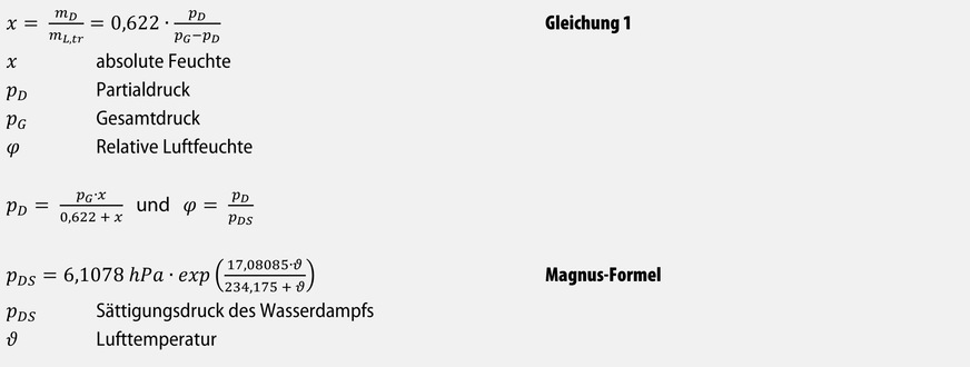 Weitere Größen zur Beschreibung eines Zustandspunktes der „Feuchten Luft“ sind die absolute Feuchte (Feuchtegehalt) x und Teildruck des Wasserdampfs (Partialdruck) pD bei einem vorgegebenen barometrischen oder Gesamtdruck pG (siehe auch Gleichung 1). Dabei ist die relative Feuchte φ das Verhältnis von Wasserdampfpartialdruck zum Sättigungsdruck des Wasserdampfs pDS bei gleicher Temperatur. Mit diesen bekannten thermodynamischen Zusammenhängen wird der Luftzustand exakt beschrieben.