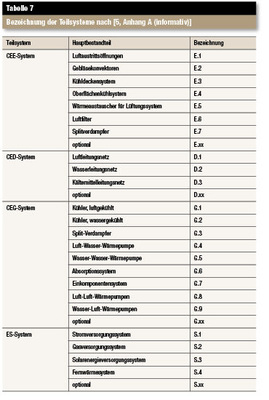 Anmerkungen zur Tabelle 8 weisen daraufhin, dass die ausführliche Auflistung der Hauptbestandteile durch Aufnahme weiterer Nummern möglich ist und dass fehlende Hauptbestandteile optional hinzugefügt werden können. Dass nur auf Kühlsysteme Bezug genommen wird, dürfte mit den Festlegungen der EPBD (s.o.) zusammenhängen. Die Befeuchtung wird weder im Hinblick auf die Hygiene (VDI 6022) noch bezüglich des Energieverbrauchs (Dampfbefeuchtung) in Erwägung gezogen.