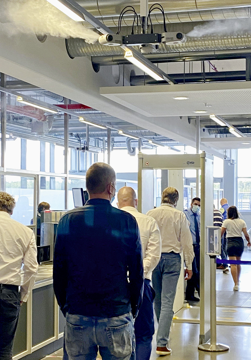 Seit 2019 sind in der Sicherheitskontrolle des Albrecht Dürer Airport Nürnberg 37 Hochdruckdüsen-Luftbefeuchter vom Typ TurboFog im Einsatz. Die von der Hallendecke abgehängten Direktraumbefeuchter sind individuell über dem Anstellbereich und der Gepäckbeförderung positioniert (Bild 4).