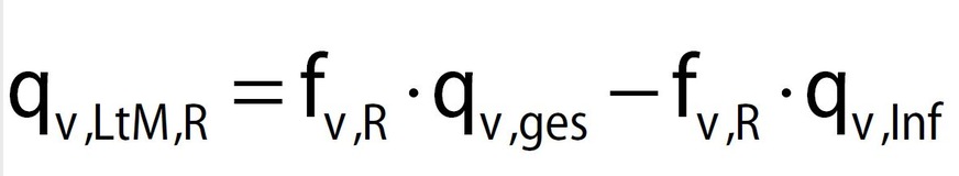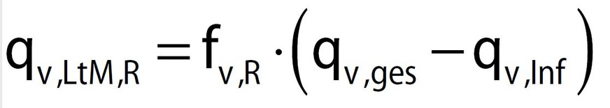 Der so erhaltene Wert für die Nutzungseinheit wird nach Volumenstromverhältnissen, welche sich aus dem Bedarf ergeben oder bei der ventilatorgestützten Lüftung für die Zulufträume über den Faktor fR,zu, auf die einzelnen Räume der Nutzungseinheit verteilt.