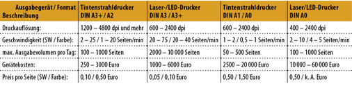 Neben den technischen Gerätedaten bestimmen auch die Wahl der Papierart und der Papierqualität darüber, wie präzise Linien oder wie brillant Farbflächen ausgegeben werden. Soll der Drucker nicht nur für die Planausgabe, sondern auch für Wettbewerbs- oder Projektpräsentationen in hoher Qualität eingesetzt werden, sind Tintenstrahldrucker die richtige Wahl. Steht dagegen eine schnelle Ausgabe von Strichgrafiken im Vordergrund, empfiehlt sich die Laser-/LED-Technik.