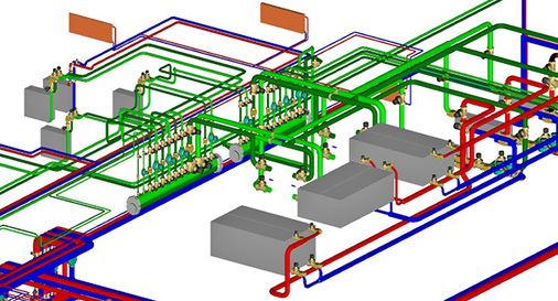 Bei komplexeren Rohrnetzen verliert man ohne 3D-Planung allerdings schnell die Übersicht. Ist das Heizungsrohrnetz weit verzweigt und geht es über mehrere Geschosse, überwiegt der Nutzen (Visualisierung, Plausibilitätsprüfung, Kollisionskontrolle, Optimierung, Variantenbildung, Installation etc.) den Mehraufwand einer 3D-Eingabe – insbesondere wenn es schon für die Heizlastberechnung und noch für andere Gewerke genutzt werden kann.