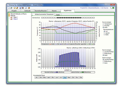 Kühllast-Berechnungssoftware ermöglicht eine erheblich genauere und individuell zugeschnittene Auslegung und Optimierung von Anlagen. Berechnet werden wichtige Werte wie die Kühllast, die Raumlufttemperatur, die operative Temperatur, der Temperaturverlauf, Energiebedarf, Verbrauchskosten und weitere Parameter für Räume aller Art mit und ohne Klimatisierung. Da sämtliche Randbedingungen frei definiert werden können, lassen sich folgende und viele weitere Fragen beantworten: