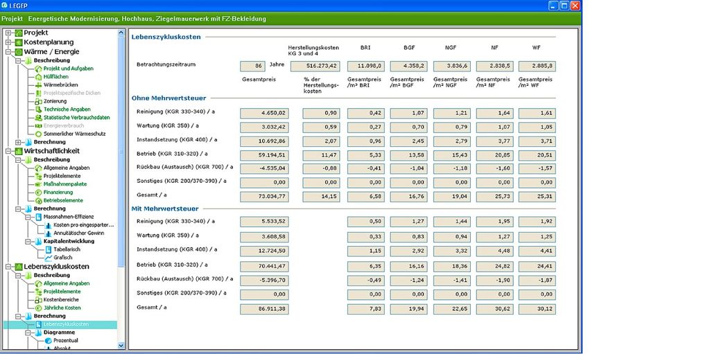 Im Hinblick auf eine ökonomisch nachhaltige Architektur ist die integrale Planung der Nutzungs- und Lebenszykluskosten unabdingbar und erhält in der Bauplanung immer mehr Bedeutung. Sie erhöht zwar den Aufwand und damit die Planungskosten, steigert aber die Wirtschaftlichkeit. Ziel der rechnergestützten Lebenszyklus-Kostenplanung von Gebäuden ist es, alle während der Erstellung, Nutzung und dem Abriss anfallenden Kosten über den gesamten Lebenszyklus hinweg zu optimieren. Ergebnis der Analyse ist ein zeitbereinigter, auf die Nutz- oder Bruttogrundrissfläche umgerechneter und damit vergleichbarer Geldbetrag Abb. 5 .