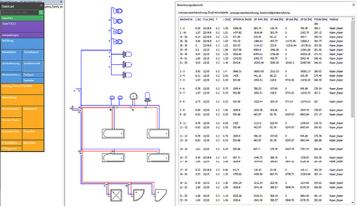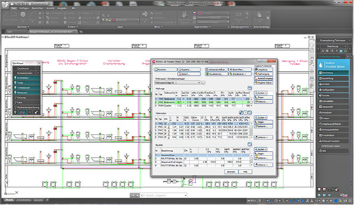 Auch die Festlegung von Nutzungseinheiten (Bad, Küche, Hausarbeitsraum etc.) ist möglich, um die Installation weiter zu optimieren. Als Ergebnis erhält man ein qualifiziertes Strangschema mit allen entscheidenden Angaben – vom eingesetzten Rohrmaterial mit entsprechender Nennweite – bis hin zum Fließdruck an jeder Entnahmestelle. Damit lässt sich sowohl die Wirtschaftlichkeit und Betriebssicherheit der Trinkwasser-Installation dokumentieren, als auch die Versorgungssicherheit an den Zapfstellen nachweisen.