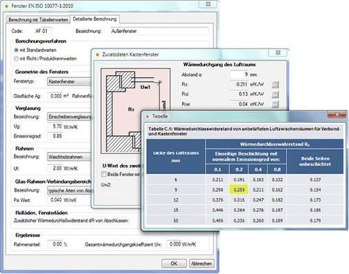 Auch Hersteller von Baustoffen und Bauprodukten bieten für die Grobauslegung überschlägige U-Wert-Rechner mit herstellerspezifischen Katalogen, zum Beispiel Knauf, TMP, Weru, Wicona etc. Speziell für Fenster und Haustüren werden auch herstellerunabhängige U-Wert-Rechner angeboten, wie ProCalc von Zaremba Software Engineering oder die App Caluwin von Sommer-Informatik. Diese kann man auch für Bauteilnachweise nach DIN EN ISO 10 077-1 [6] verwenden, inklusive aller Kennzahlen von Profilen, Gläsern, Füllungen, Brüstungen, des Randverbunds, von Sprossen etc.
