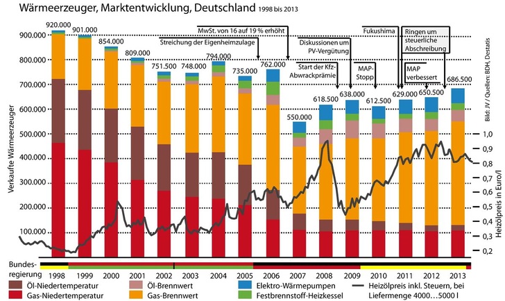 Stärker als der Markt ist 2013 die Verkaufszahl für Gas- und Öl-befeuerte Wärmeerzeuger um 7 % auf 599.000 Stück gewachsen. Die Entwicklung bei den beiden Haupt-Energieträgern im Wärmemarkt fiel erneut sehr unterschiedlich aus. Im Segment Gas-Brennwert gab es einen Zuwachs um 10 % auf 421.500 Stück (Marktanteil 61,4 %), bei Gas-Niedertemperatur stieg der Absatz um 2 % auf 110.000 Stück (Marktanteil: 16,0 %). Das Segment Öl-Brennwert verlor gegenüber dem Vorjahr 2 % auf 46.000 Heizkessel (Marktanteil: 6,7 %), bei Öl-Niedertemperatur betrug der Absatzrückgang 8 % (2012: 19 %) auf 21.500 Heizkessel (Marktanteil: 3,1 %).